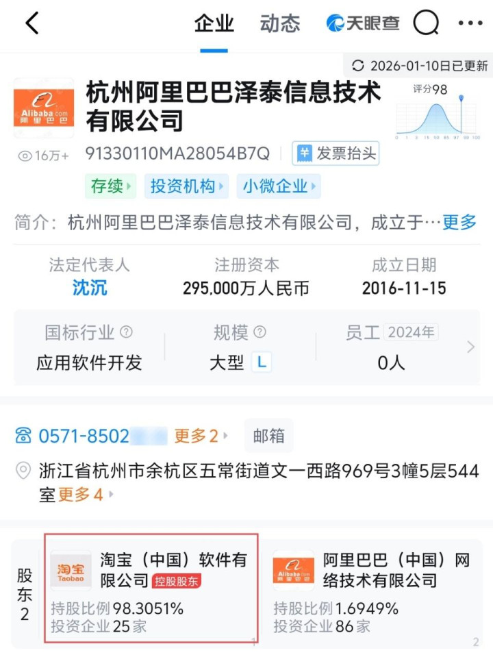 天眼查App显示,阿里泽泰的控股股东是淘宝(中国)软件有限公司,后者直接持股比例为98.3051%。