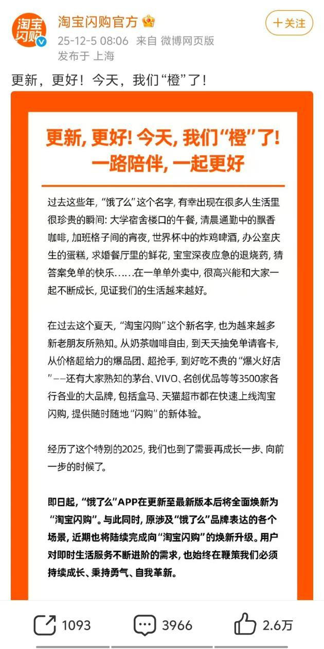 到了12月,饿了么APP正式更名为“淘宝闪购”,标志着阿里即时零售业务的协同效应正式固化,形成统一的品牌认知。