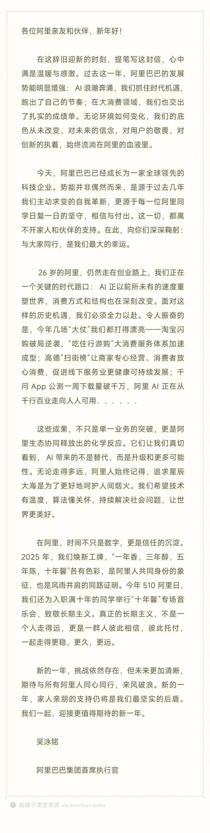 阿里CEO吴泳铭在新年家书中表示,2025年几场“大仗”打得很漂亮——淘宝闪购破局逆袭,“吃住行游购”大消费服务体系加速成型;“高德扫街榜”让商家专心经营、消费者放心消费,促进线下服务业更健康可持续发展;千问APP公测一周下载量破千万,阿里AI正在从千行百业走向人人可用......