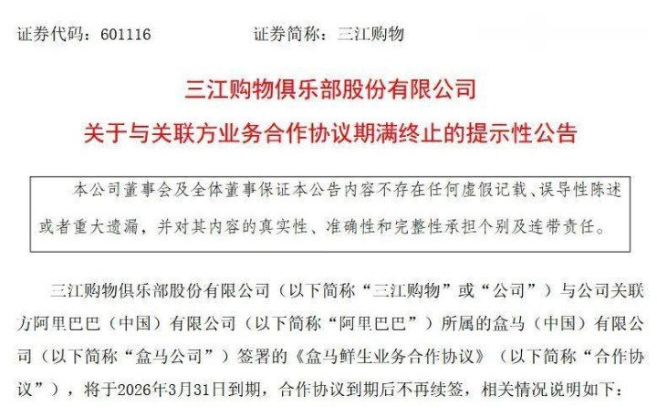 值得一提的是,三江购物与盒马的合作已进入倒计时:2025年8月初,三江购物发布公告称,公司与盒马的合作协议将于2026年3月31日到期,且到期后不再续签。