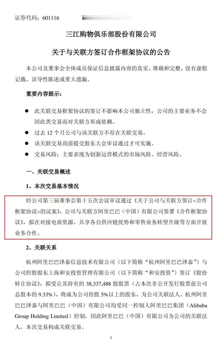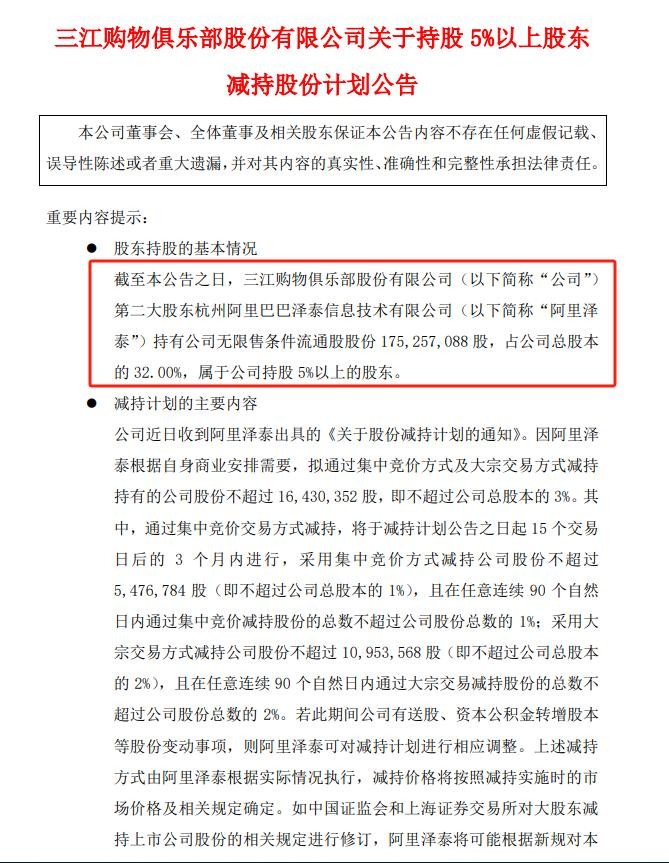 2月5日,三江购物发布公告披露,公司持股5%以上股东杭州阿里巴巴泽泰信息技术有限公司(下称 “阿里泽泰”)已完成此前披露的减持计划,本次累计减持公司股份1643.04万股,占公司总股本的3%,减持套现总金额约2.52 亿元。本次减持完成后,阿里泽泰对三江购物的持股比例由原本的30%降至27%。