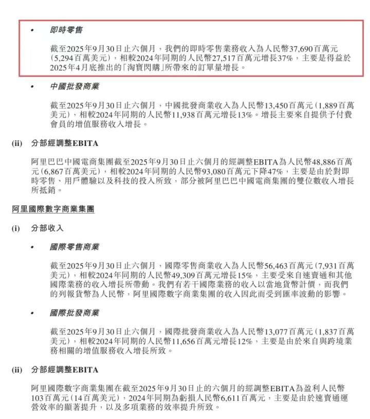 阿里巴巴2026财务年度中期报告显示,截至2025年9月30日止六个月,阿里巴巴的即时零售业务收入为人民币37,690百万元(5,294百万美元),相较2024年同期的人民币27,517百万元增长37%,主要是得益于2025年4月底推出的淘宝闪购所带来的订单量增长。
