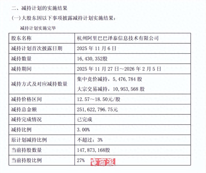 公告显示,阿里泽泰的此次减持计划早在2025年11月6日便已对外披露,拟通过集中竞价及大宗交易方式减持不超过1643.04万股(占公司总股本3%),减持期间为2025年11月27日至2026年2月5日。截至2026年2月5日,该减持计划已实施完毕。